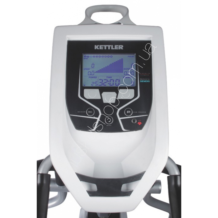 Компьютер: Эллиптический тренажер Kettler ELYX 5 7655-500 имеет монохромный LCD дисплей (время тренировки, скорость, пройденная дистанция, частота вращения педалей, расход калорий, пульс, графическое отображение профиля величины нагрузки, средние значения параметров в конце тренировки, контроль за верхним пределом пульса.