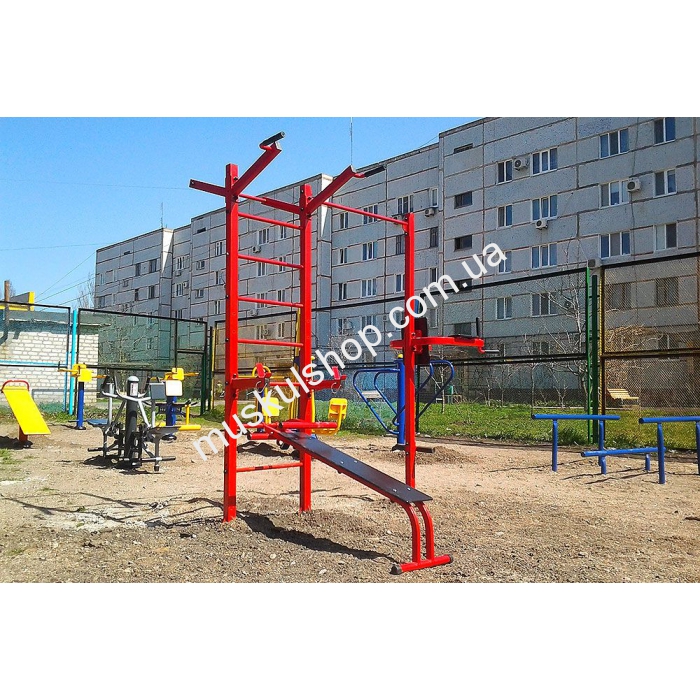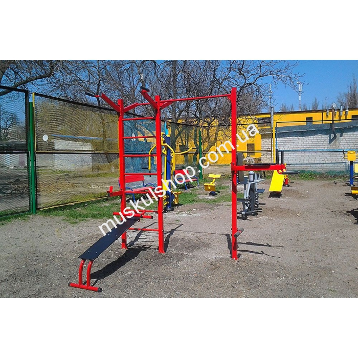 Атлетический комплекс Интер Атлетика УТ101 позволит выполнять все упражнения, осуществлять подтягивание, качать пресс, для косых и прямых мышц брюшного пресса, а также выполнить приседания и жим со штангой, качать бицепсы, голень, укрепить плечевой пояс, спину, руки и шею. Не рекомендованы занятия при снегопаде, дожде и сильном ветре, чтобы нивелировать возникновение травматизма. Безупречный комплекс для занятий на свежем воздухе, укрепления общего иммунитета не только ребенка и его здоровья, но и взрослого. Выполнена модель из прочного, качественного стального сплава, общая длина составляет 2,10 м, а высота 2,45 м, способен выдержать нагрузку 130 кг, при этом вес комплекса составляет 105 кг, представлен в красном цвете.
