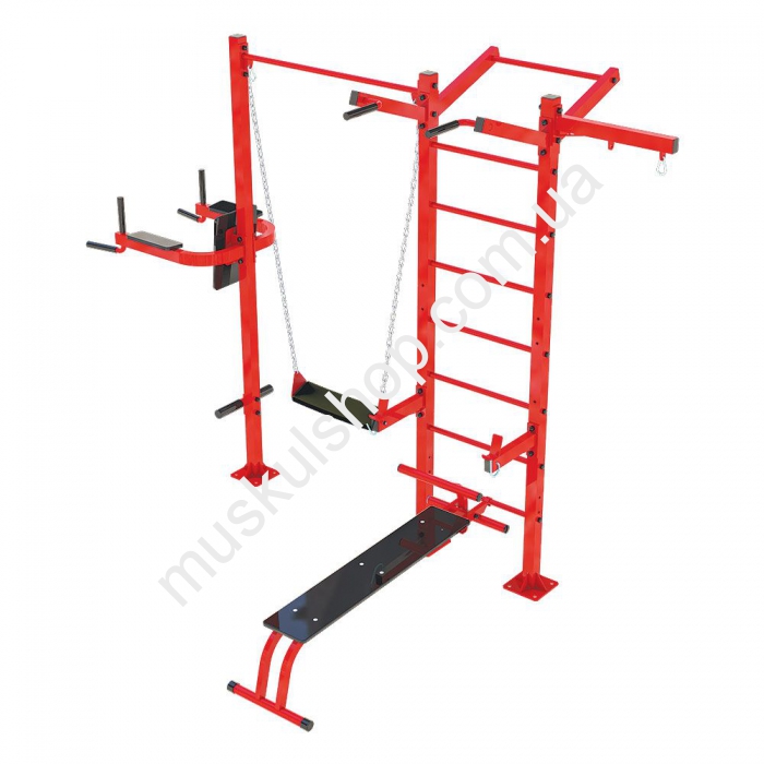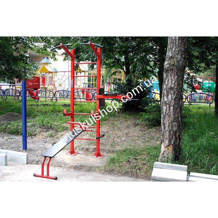Атлетический комплекс Интер Атлетика УТ102 отличается наличие качели на цепях. Выполнена модель из прочного, качественного стального сплава, общая длина составляет 2,65 м, а высота 2,45 м, способен выдержать нагрузку 130 кг, при этом вес комплекса составляет 135 кг, представлен в красном цвете. Не рекомендованы занятия при снегопаде, дожде и сильном ветре, чтобы нивелировать возникновение травматизма. Отличный комплекс для занятий на свежем воздухе, укрепления общего иммунитета не только ребенка и его здоровья, но и взрослого. На комплексе можно выполнять много различных физических упражнений, он оснащен турником для подтягивания, доской для пресса, которая позволяет качать косые и прямые мышцы брюшного пресса, а также выполнить приседания и жим со штангой, качать бицепсы, голень, укрепить плечевой пояс, спину, руки и шею.