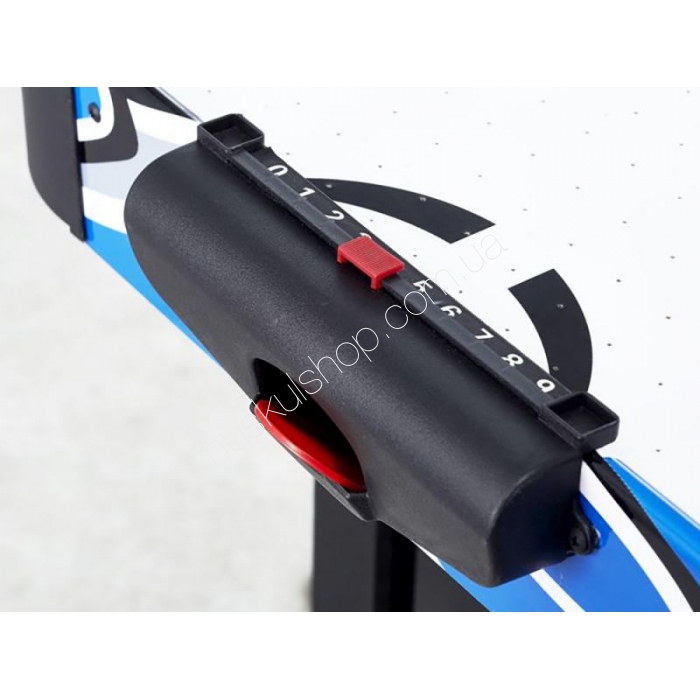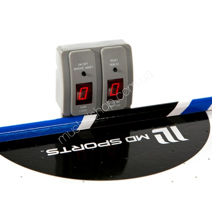 Оборудован электронным счетчиком голов (табло работает от батареек ААА (2 шт), а также мощным мотором для скольжения шайбы (работает от электросети 220 В).