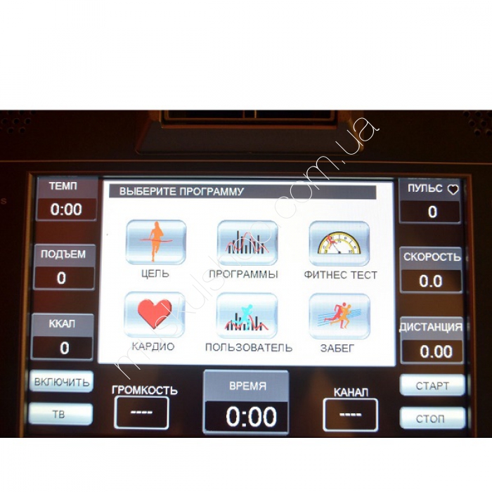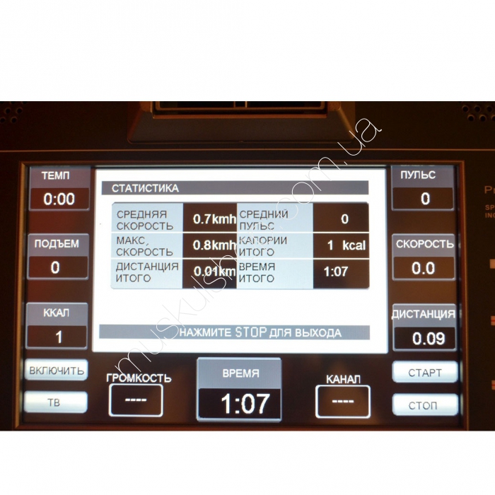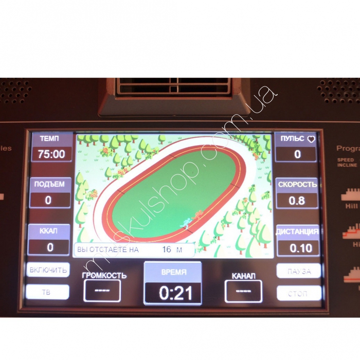 Показания дисплея: Cкорость, время, дистанция, калории, пульс, угол наклона, профиль нагрузки