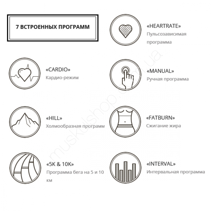 Показания дисплея: Cкорость, время, дистанция, калории, пульс, угол наклона, профиль нагрузки