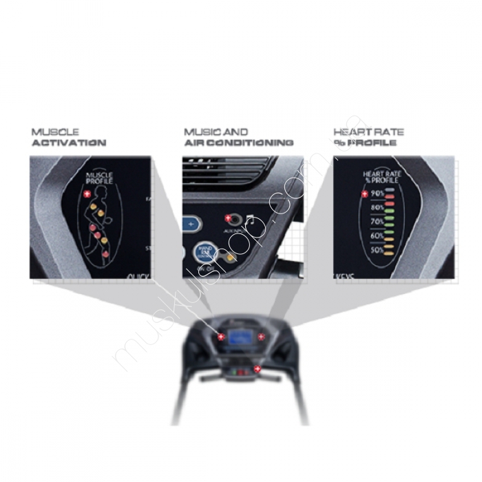 Программный модуль имеет двенадцать тренировочных программ + 6 "горячих" клавиш для быстрого изменения скорости и угла наклона обеспечивают дополнительный комфорт в управлении; Приятный дизайн консоли с контрастным 9'' LCD дисплеем, отображающим всю необходимую информацию во время занятия и резюмирующим данные после окончания тренировки; Уникальная функция контроля частоты сердцебиения Heart Rate, выполненная в виде графической цветовой шкалы, которая, исходя из возраста, показывает соотношение текущего пульса к максимально допустимому пульсу. Индикатор загорается янтарным цветом при нагрузке в 50-60%, зеленым 65% — 80%, а красным при 85% и выше, это позволяет проводить тренировку с максимальной эффективностью; Функция контроля активированных групп мышц во время тренировки Muscle activation, выполненная в виде графической цветовой шкалы, отображающей степень нагрузки и вовлеченности в работу групп мышц; Встроенный в центральную консоль вентилятор обдува тела занимающегося; Качественное износоустойчивое 2-х слойное беговое полотно с большой беговой поверхностью 56 х 152 см. Амортизационная платформа выполнена на VCS-эластомерах. Специальные подушки эффективно поглощают ударную нагрузку, сохраняя суставы и обеспечивая безопасные тренировки, что особенно важно для длительных тренировок; Реверсивная двухсторонняя парафинированная 25-ти мм феноловая дека; Дополнительные кнопки управления скоростью и углом наклона бегового полотна на боковых поручнях (0~9); Сенсорные датчики измерения пульса расположены на эргономичных рукоятках + телеметрия (совместимость с нагрудными датчиками Polar). Внутренняя цифровая система измерения пульса имеет высокую помехоустойчивость; Нагрудный датчик пульса поставляется в комплекте с беговой дорожкой; Встроенная звуковая стереосистема, подключение MP3 и iPod; Держатель для бутылки, полка для журналов, мобильного телефона; Транспортировочные ролики.