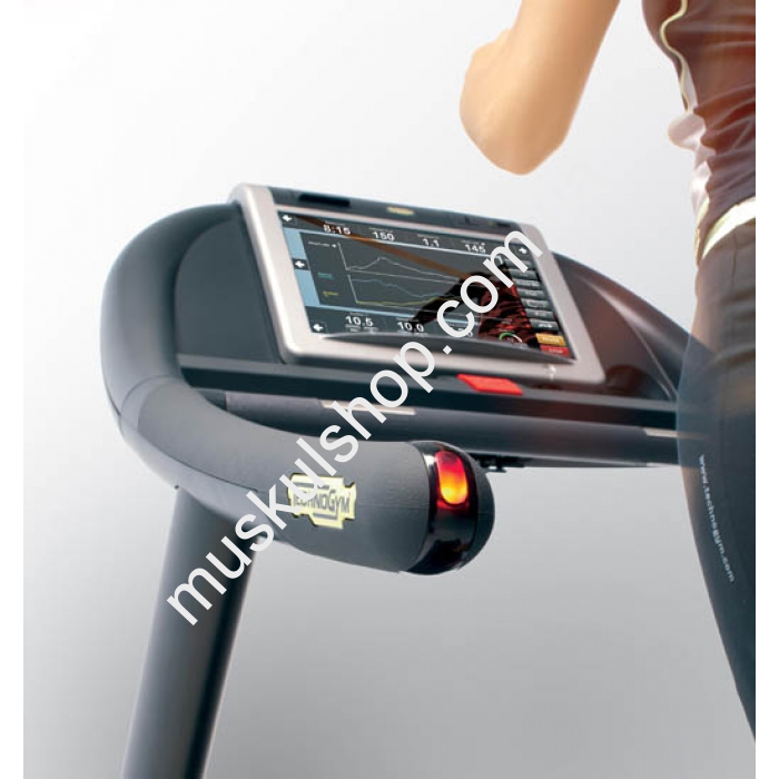 Беговая дорожка Техноджим Ран 700 ТВ айпод является профессиональным тренажёром, который подойдёт как для специализированного спортивного учреждения, так и для дома. Вы сами можете выбирать необходимую программу для тренировок, предварительно устанавливая её сложность. Компьютер же поможет вам в этом, поскольку его консоль проста для понимания и эффективна в управлении. Поручни дорожки выполняют не только функцию поддержки, но и измерения пульса, поскольку в них встроены небольшие датчики. для того, чтобы сделать тренировки более комфортными, тренажёр оснащён держателями под бутылку с водой.