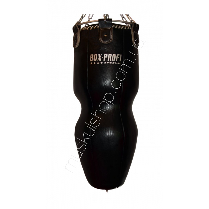 Универсальный мешок для бокса, полностью соответствует силуэту человека, поможет отработать различные удары, под особыми углами и наклонами. Внизу мешка размещено стальное кольцо для резинового шнура. Универсальный мешок подходит также каратистам, кикбоксерам и другим бойцам восточных единоборств, для нанесения ударов ногами. Длина мешка 110 см, а ширина 45 см, представлен в черном цвете, фирменного стиля, общей массой 60 кг. Швы мешка с двойной прошивкой, это поможет продлить срок. Крепится мешок благодаря стальным 8 мм цепям и прочному карабину, толщиной в 14 мм. Набивка способна выдерживать мощные удары, не терять при этом свою форму. Наполнитель мешка текстильный материал, пошит с цельной, качественной и эластичной кожи, толщиной около 6 мм.