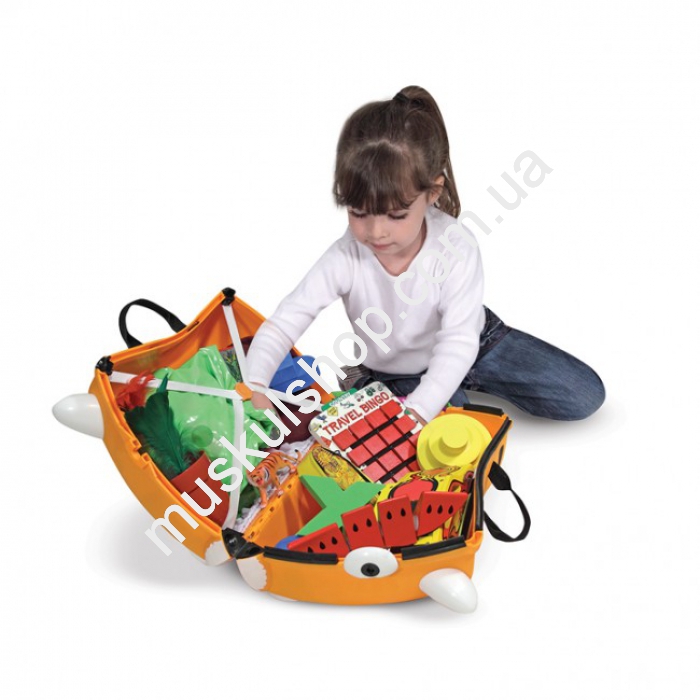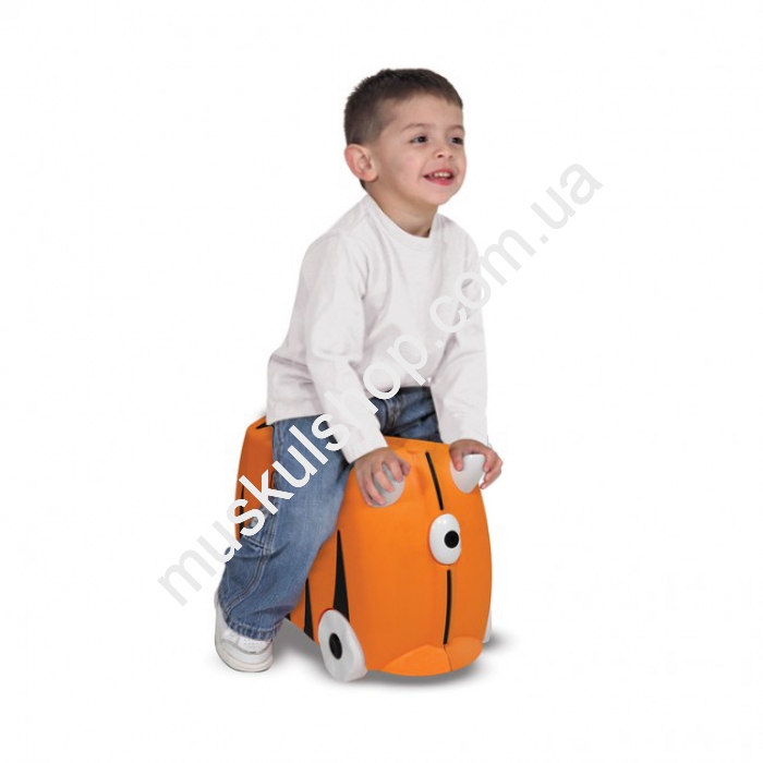 Он изготовлен из прочного пластика, установлен на колёса и имеет седлообразную форму – на чемодане Trunki ребёнка можно катать, взяв на буксир!