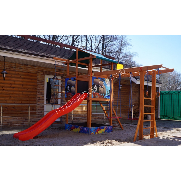 Детская площадка Sportbaby-14 комплектуется рукоходом, качелями, башней с песочницей, горкой для спуска, кольцами для упражнений, лестницей из веревок. Такой комплекс может выдерживать свыше 80 кг веса малышей. Площадка состоит из нескольких лестниц, позволяя малышам устроить небольшие соревнования. Конструкция из сосны, пропитанная специальным средством, нет острых углов и тяжелого металлического крепления, а также химических веществ, а горка покрыта качественной водоэмульсионной краской. Тут детишки не только займутся делом, но и укрепят свой иммунитет. Такая деревянная площадка идеально подойдет для загородных домов и дач. Играть на такой площадке могут сразу несколько непосед, рассчитана модель на большую семью.