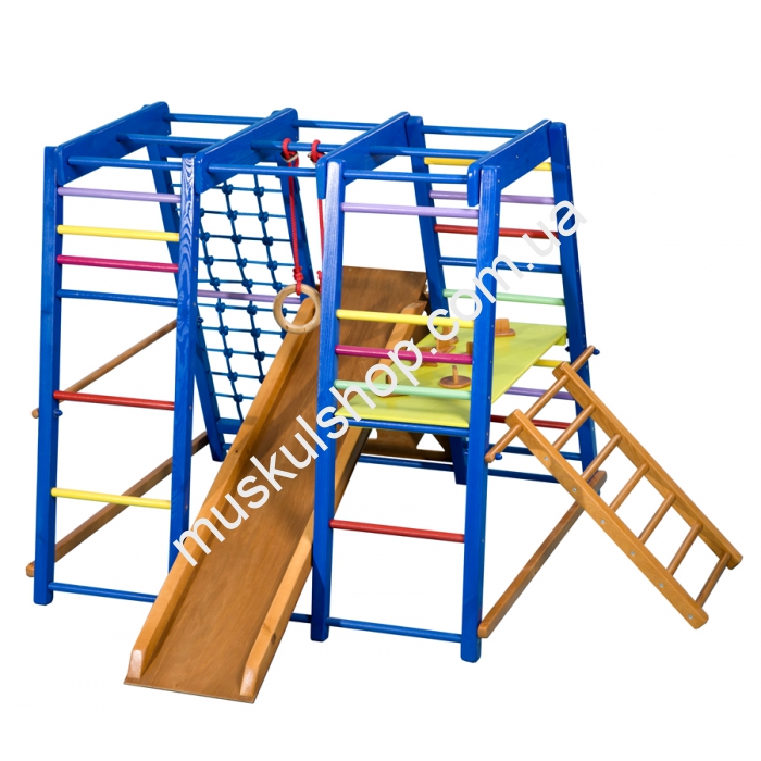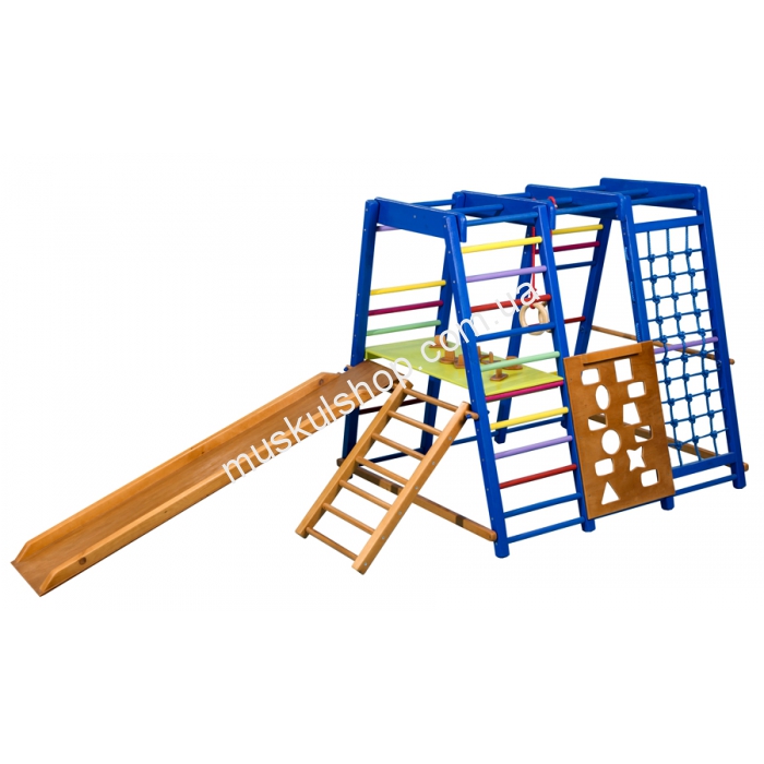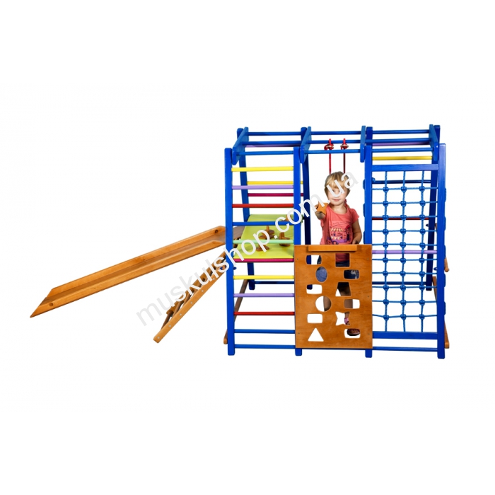 Детский спортивный комплекс SportBaby Акварелька мини обладает современным и красочным дизайном, который придётся по вкусу как девочкам, так и мальчикам. Спортивные атрибуты, которые присутствуют в данном комплексе, поспособствуют всестороннему развитию маленького пользователя. Самым приятным сюрпризом для малыша, наверняка, станет небольшая горка. Плюсом данного комплекса можно назвать то, что его можно устанавливать в помещении, для которого он, фактически, и предназначается. Стоит также упомянуть о том, что весь комплекс создан из высококачественной и прочной породы дерева.