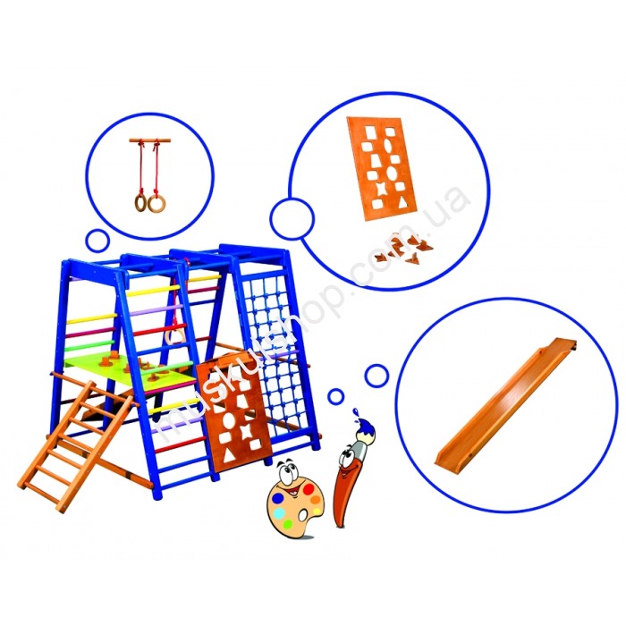 Детский спортивный комплекс СпортБэйби Акварелька мини это идеальный комплекс, который одновременно совмещает в себе как небольшую игровую площадку, так и специальные образовательные дополнения. Сразу после установки он станет излюбленным местом, где ваш малыш сможет вдоволь поиграть, одновременно развиваясь умственно. Данный комплекс продуман до последней мелочи, даже расстояние между перекладинами просчитано до миллиметра. Данное приспособление было создано при учёте физиологических особенностей малышей и ориентируется оно на пользователей дошкольного периода.