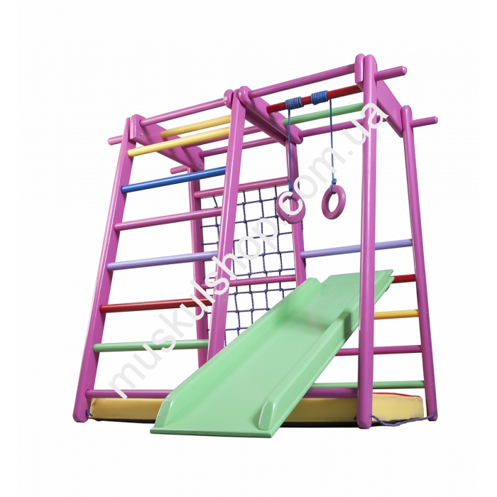 Детский спортуголок Sportbaby Кроха-2 Барби настоящий миниатюрный спортзал, в нем все предусмотрено от шведской стенки до гладиаторской сетки, а также кольца, мат для выполнения различных упражнений, горка для спуска и кольца. Уголок выполнен из сосны и бука, представлен в цветном оттенке. Комплекс хорошо развивает руки малышей, укрепляет их мышцы, а также поднимает иммунитет и выносливость. Комплекс выдерживает нагрузку до 80 кг, при этом масса самого изделия не превышает 40 кг. Даже малыш в возрасте одного года будет на таком комплексе творить невозможное. В производстве комплекса применялись только экологически чистые материалы. Конструкция очень устойчива и безопасная.