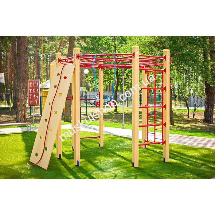 Гимнастический комплекс Атлет Интер Атлетика S724.1 оснащен рукоходом, гимнастическими кольцами, лестницей, перекладинами, доской для скалолазания и другими. Изготовлен комплекс из прочного, деревянного бруса, его устанавливают на детских площадках, но и дачах, загородных комплексах, базах отдыха, школах и детских лагерях. Общая длина комплекса составляет 3,42 метров, а высота 2,54 метра. Рассчитана модель на детей в возрасте от 6 до 12 лет, модель поможет развить мышцы рук, ног, пресса и суставы, представлена в красном цвете, способная выдерживать нагрузку 80 кг на 1 пользователя. Модель абсолютно безопасная и безвредная, есть различные сертификаты качества и безопасности эксплуатации. Категорически запрещена эксплуатация в снег, дождь и сильный ветер, чтобы нивелировать возникновение травматизма.