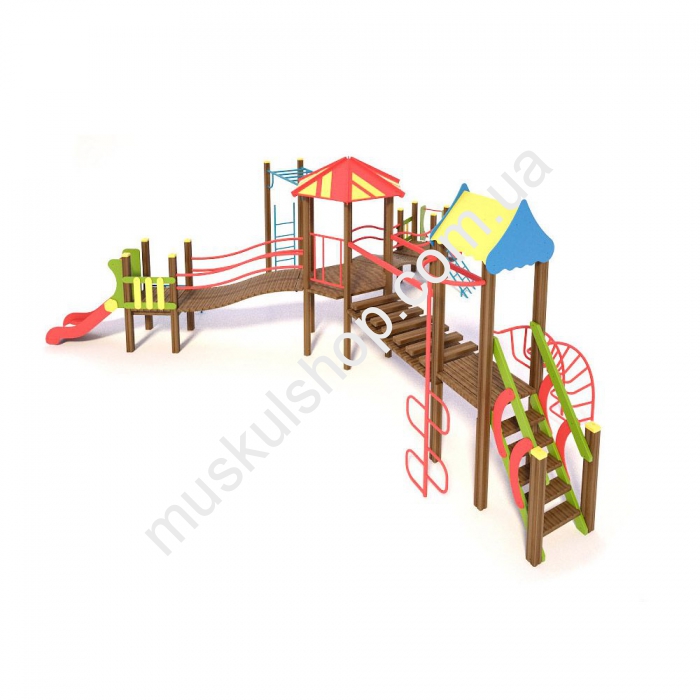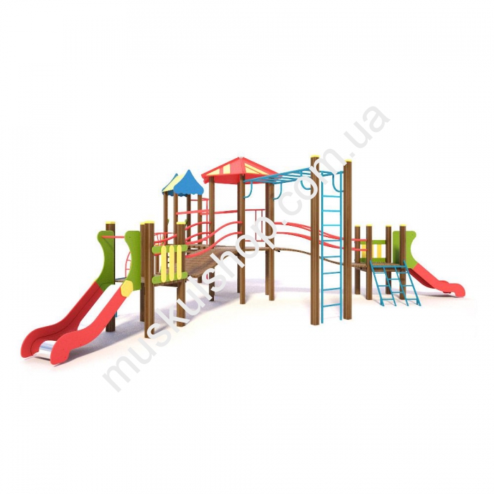 Игровой комплекс Бабочка Интер Атлетика T806 оснащен рукоходом, горкой для крутого спуска, трапом для подъема, дуговой лестница, лестницей с гнутой трубы и другими снарядами. Модель оснащена двумя домиками, которые соединены между собой прочным мостиком, ее устанавливают на детских площадках, на дачах, игровых площадках, базах отдыха и школах. Комплекс выполнен в разноцветном оттенке, общая длина составляет 8,67 м, а высота 3,08 м, рассчитан на детишек от 3 до 6 лет, способен выдерживать нагрузку 80 кг на 1 пользователя. Категорически запрещена эксплуатация при снегопаде, дожде и сильном ветре, чтобы нивелировать возникновение травматизма, необходимо держаться в момент игры за поручни. Модель развивает у детишек выносливость, координацию движения, а также сделать прогулки на свежем воздухе полезными для здоровья.