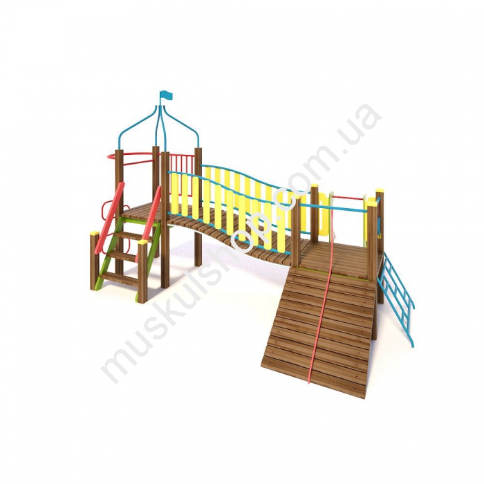 Игровой комплекс Мостик Интер Атлетика ТЕ811 оснащен домиком, на крыше размещен флажок, лестницей для поднятия и спуска, трапом для бега, винтовой лестницей для упражнений. Категорически запрещена эксплуатация при снегопаде, дожде и сильном ветре, чтобы нивелировать возникновение травматизма, необходимо держаться в момент игры за поручни. Модель развивает у детишек выносливость, координацию движения, а также сделать прогулки на свежем воздухе полезными для здоровья. Модель устанавливают на детских площадках, на дачах, игровых площадках, базах отдыха и школах. Комплекс выполнен в разноцветном оттенке, общая длина составляет 3,33 м, а высота 3,01 м, рассчитан на детишек от 3 до 6 лет, способен выдерживать нагрузку 80 кг на 1 пользователя.