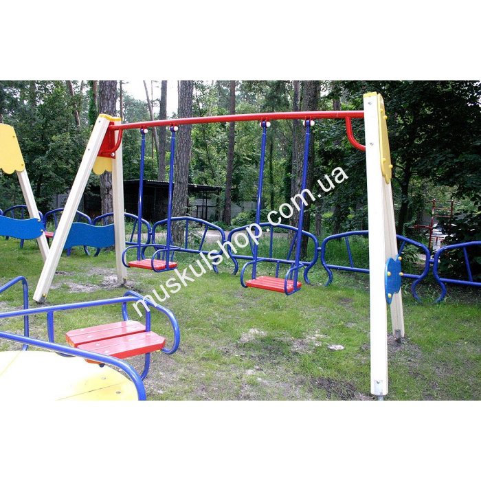 Качели Inter Atletika двойные, установлены на деревянных стойках, перекладина металлическая, способная выдерживать нагрузку в 80 кг, устанавливается на дачах и загородных комплексах, детских площадках, лагерях и базах отдыха, легко транспортируется, обладает весом 127 кг. Не рекомендована эксплуатация в снегопад, гололед, дождь, во избежание травматизма. Качалка не нуждается в большом количестве места под свое расположение, абсолютно безопасная и безвредная, есть различные сертификаты. Процесс установки происходит путем бетонирования основания либо прикручивания болтами. После нескольких годов интенсивной эксплуатации, такие качели не поменяет свой первоначальный облик. Модель рассчитана на детишек от 6-ти до 12 лет.