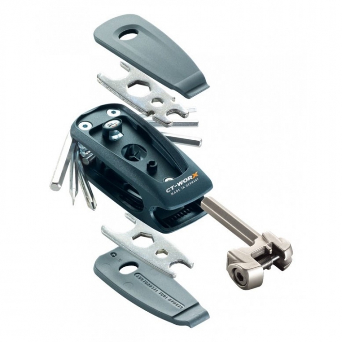Набор инструмента SKS CT-Worx 10014 прекрасно подойдёт практически под любую марку велосипеда. Каждый из компонентов защищён внешним корпусом, в который и прячутся маленькие инструменты, когда они не используются. При использовании представленного мультитула, фактически, у вас в кармане всегда будет мини-набор, и вам не придётся вечно таскать огромные ящики с различными инструментами. Данный мультитул можно использовать даже в экстремальных ситуациях, а потому он является просто незаменимым инструментом для любого пользователя. Все компоненты данного приспособления устойчивы перед износом и созданы с применением только самых качественных и прочных приспособлений. Набор инструмента СКС CT-Воркс 10014 хоть и маленькое, но невероятно удобное и полезное приспособление, которое вмещает в себе сразу несколько самых разнообразных инструментов.