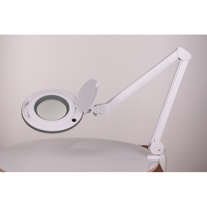 Настольная лампа-лупа Asf комплектуется крышкой для защиты линзы от царапин и пыли, ручкой на верху лампы для удобства вращения и переноски. Модель белого цвета, подойдет под любой интерьер косметологического кабинета. Аппарат позволит исследовать все участки кожи, осмотреть поры кожи клиента салона, небольшие за размером морщины, а также микротрещины кожи. Лупа помогает получить необходимый степень увеличения, а также необходимый уровень освещения для проведения определенного вида косметологических процедур. Линза изготовлена из стекла, ее диаметр составляет 12,5 см, потребляет 6 Вт, способна увеличить до 5 диоптрии, комплектуется 60 светодиодными лампочками для подсвечивания и прогревания проблемных участков кожи.