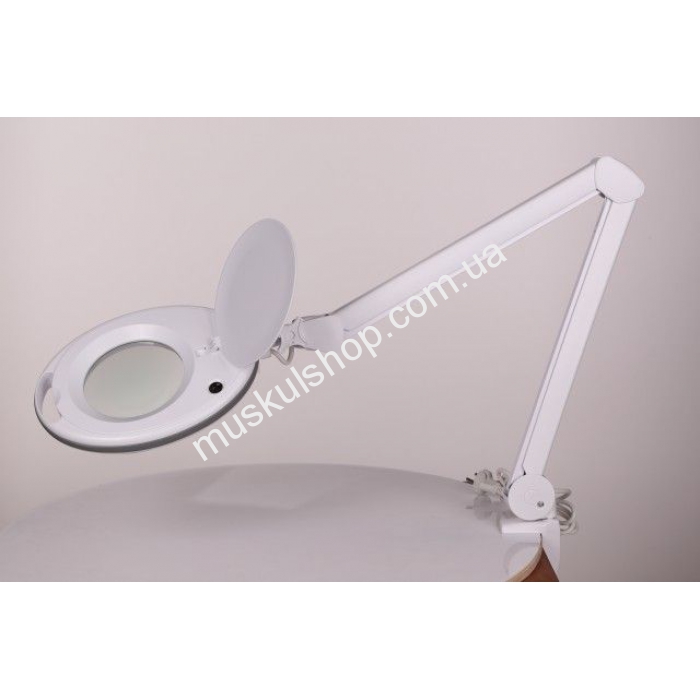 Настольная лампа-лупа Asf Данная модель жизненно важна при проведении диагностики и выбора способа эффективного лечения определенного заболевания. Предусмотрено 90 шт. светодиодных лампочек. Аппарат способен осмотреть поры кожи клиента салона, небольшие за размером морщины, а также микротрещины кожи. Лампа-лупа поможет получить необходимый степень увеличения, а также необходимый уровень освещения для проведения определенного вида косметологических процедур, потребляемая мощность всего 9 Вт. На верху лампы размещена ручка, для удобства вращения и транспортировки, а также крышка для защиты линзы от царапин и пыли. Линза изготовлена из стекла, ее диаметр составляет 12,5 см, способна увеличить до 5 диоптрии, представлена в белом цвете, впишется в любой интерьер косметологического кабинета.