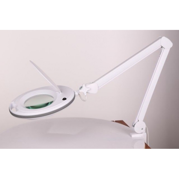 Настольная лампа-лупа Asf подобного типа позволит подробно осмотреть поры кожи клиента салона, небольшие за размером морщины, а также микротрещины кожи. Лампа-лупа поможет получить необходимый степень увеличения, а также необходимый уровень освещения для проведения определенного вида косметологических процедур, потребляемая мощность всего 22 Вт. Линза изготовлена из стекла, ее диаметр составляет 12,5 см, способна увеличить до 5 диоптрии, представлена в белом цвете, впишется в любой интерьер косметологического кабинета. Данная модель жизненно важна при проведении диагностики и выбора способа эффективного лечения определенного заболевания. На верху лампы размещена ручка, для удобства вращения и транспортировки, а также крышка для защиты линзы от царапин и пыли.