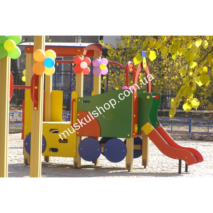 Паровозик с горкой Интер Атлетика T502 представлен в виде детского паровозика, придется по душе не только мальчикам, но и девочкам. Игровой комплекс представлен в разноцветных тонах, выполнен с прочного, качественного и натурального дерева, с добавлением стали и фанеры. Общая масса изделия составляет 221,6 кг, способно выдержать общую массу в 80 кг, идеальный вариант для детишек от 2-х до 7 лет, устанавливается в помещениях, дачах и загородных комплексах, базах отдыха, детских лагерях, возле водоемов. Для лучшей фиксации комплекса, необходимо забетонировать основание. Материалы качественные и после нескольких годов интенсивной эксплуатации, такая детская горка не поменяет свой первоначальный облик. Оснащен паровозик всем необходимым, а именно поручнями во время поездок и поднятия, а также горкой для крутого и молниеносного спуска.