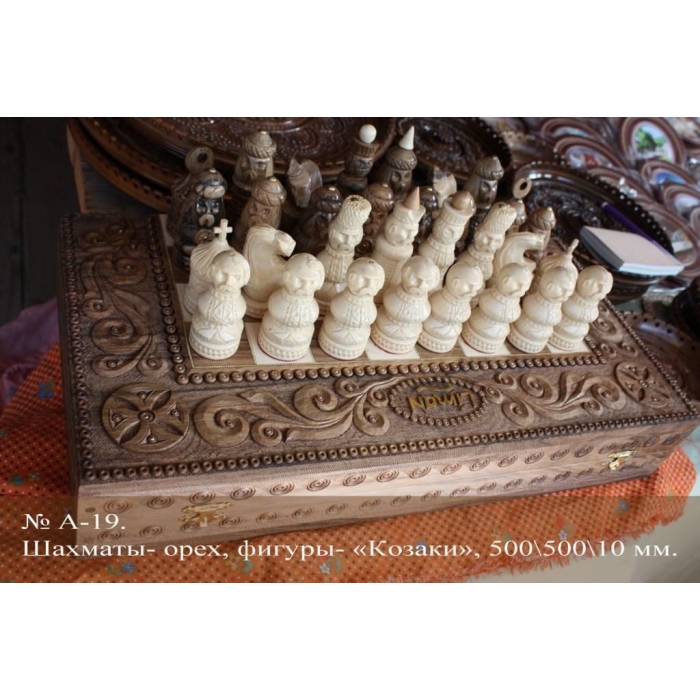 Шахматы Мастер А-04, 19 дерево напоминают форму казаков, выполнены из прочной, качественной и влагостойкой породы деревьев ольхи и ореха, на выбор несколько цветовых гам и вариантов полотен. Шахматы хорошо ложатся в руку, не выскальзывают, плотно прижимаются к доске, в меру тяжелые. Настольные шахматы станут хорошим подарком на дни рождения, юбилеи, игры в семейном кругу либо на природе. Размеры игрового полотна в форме квадрата, составляют 50 на 50 см, высота 8 и 1 см. Шахматы приучают людей к логическому мышлению, вырабатывают усидчивость, силу воли, позволяют просчитать несколько ходов наперед и одержать долгожданную победу. Модели изготовлены резьбовым методом, исключительно руками, не содержат вредных веществ, красок и прочих химикатов, вредных человеческому организму.
