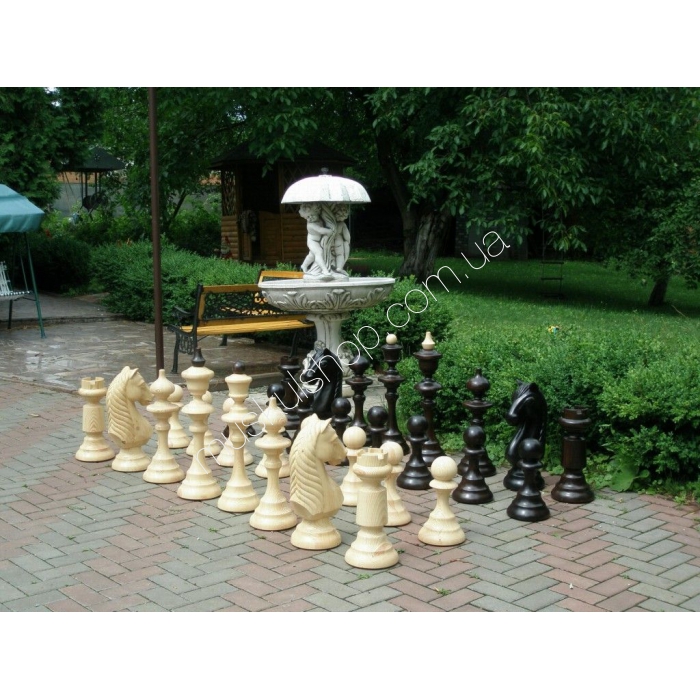 Шахматы напольные уличные (дерево) укомплектованы фигурками различных размеров и цветов, они хорошо ложатся в руку, не выскальзывают, плотно прижимаются к поверхности пола либо земли. Диаметр фигурки внизу составляет 25,5 см, а высота колеблется от 35-70 см. Они придутся по душе любителям и профессионалам игры в шахматы, размещаются в саду, парках, детских площадках и т.д. Шахматы изготовлены с прочных пород дерева, способные противостоять солнцу и дождям. Модель не содержат вредных веществ, красок и прочих химикатов, вредных человеческому организму. Шахматы приучают людей к логическому мышлению, вырабатывают усидчивость, силу воли, позволяют просчитать несколько ходов наперед и одержать долгожданную победу. Время полного изготовления подобного вида шахмат составляет 30-45 дней.