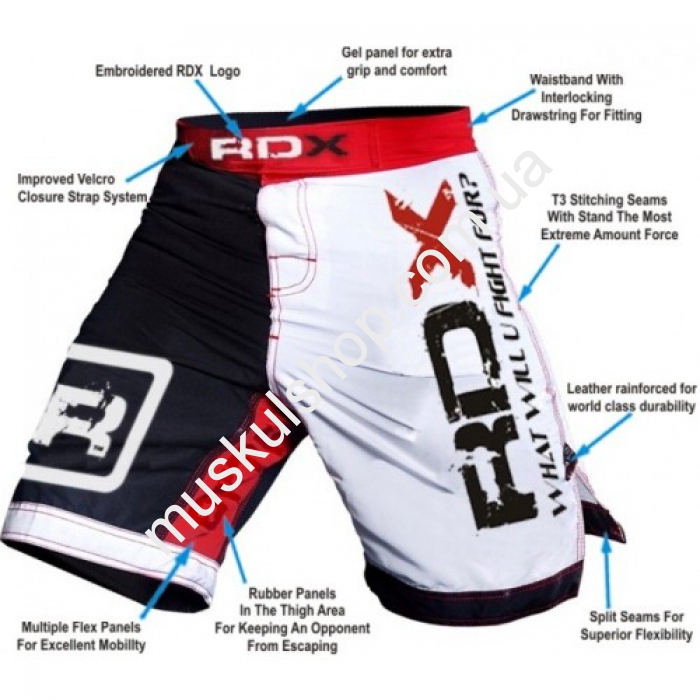 Шорты RDX предназначены для боя, они выполнены из сверхпрочной парусиновой ткани, она не сковывает движения в момент интенсивного боя, а для полного обеспечения комфортности по бокам шорт предусмотрены разрезы. Область паха представляет из себя клин, пошитый из стрейчевого материала. Большой прочности бойцовским шортам придают вставки из мягкой резины на бедрах спортсмена. Фиксация пояса обеспечивается прочной липучкой высокого качества. Стильности шортам придает логотип бренда. Бойцовские шорты соответствует всем международным требованиям, имеет сертификаты качества. На внутренней стороне шорт предусмотрены гелевые панели, а также предусмотрен карман.