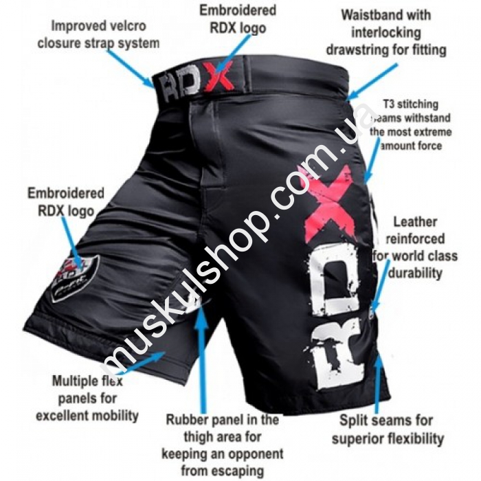Шорты RDX пошиты из прочной, качественной и надежной парусиновой ткани. Фиксируются шорты при помощи прочной липучки высокого качества. Область паха представляет из себя клин, пошитый из стрейчевого материала. Представлены шорты в черном цвете с фирменным логотипом. Ткань модели не сковывает движения в момент интенсивного боя, а для полного обеспечения комфортности по бокам шорт предусмотрены разрезы. Большой прочности бойцовским шортам придают вставки из мягкой резины на бедрах спортсмена. Бойцовские шорты соответствует всем международным требованиям, имеет сертификаты качества. На внутренней стороне шорт предусмотрены гелевые панели, а также предусмотрен карман. Шорты способны выдерживать интенсивные тренировки и затяжные бои.