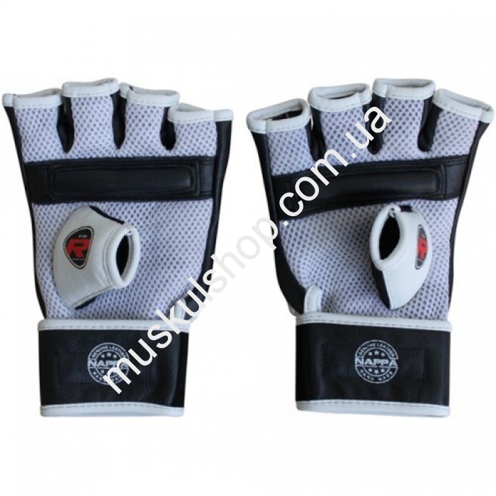 Перчатки RDX выполнены из качественной, прочной и эластичной кожи типа Nappa, модель защищает большой палец. Наполнителем является интегрированный гель с пеной, это позволяет амортизировать сильнейшие удары, защищает руки бойца от внезапных ударов. Фиксируются перчатки благодаря прочным липучкам, не слетают даже с узкого запястья. Перчатки полностью соответствуют заявленным международным стандартам, представлены в черно-белом цвете. Абсорбирующая ткань выводит лишнюю влагу с ладоней на руку. Битки широко применяют для отработки всех видов ударов в спарринге и на спортивных снарядах, например на боксерской груше, полностью исключая риск, получения различных травм.