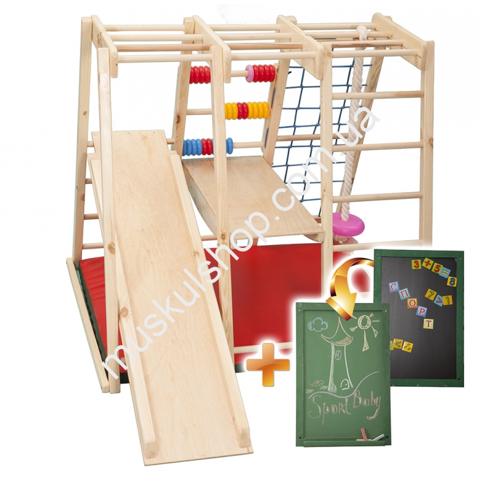 Детский домашний спорткомплекс Sportbaby Ромашка комплектуется матом для упражнений, детской горкой для спуска, шведской и гладиаторской стенкой, рукоходом, кольцами, качелями и столом, одним словом полностью подходит под маленький замок. На комплексе можно заниматься от года до шести лет. Комплекс выдерживает нагрузку до 40 кг, при этом масса самого изделия не превышает 30 кг. Уголок выполнен из сосны и бука, представлен в цвете натурального дерева. Комплекс хорошо развивает руки малышей, укрепляет их мышцы, а также поднимает иммунитет и выносливость. Конструкция очень устойчива и безопасная, а для производства комплекса применялись только экологически чистые материалы.