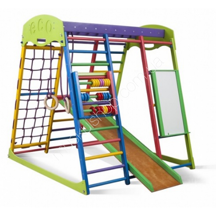 Детский домашний спорткомплекс Sportbaby Юнга укомплектован всем необходимым, и представляет из себя мини спортзал, в него вошли: сетка для гладиаторов, рукоход из шведской стенкой, 1,5 м детская горка для спуска, мат для занятий, кольца, детские счеты, качели и стол. Комплекс изготовлен из сосны, представлен в цветном цвете. Комплекс способен выдерживать нагрузку до 40 кг, при этом масса самого изделия не превышает 30 кг. Такой спортивный уголок может обеспечить хорошее настроение детишкам, независимо от погодных условий. Идеальный вариант для детей, у которых нет возможности посещать различные тренировки. Он хорошо смотрится в общем дизайне детской комнаты, не требует много места под свое размещение.