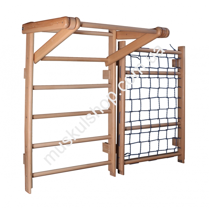 Детский спортуголок Sportbaby Растишка 2 в 1 комплектуется сеткой для юного гладиатора, стенкой с турником, канатом, трапецией, кольцами, крепежным комплектом, а для безопасности купите мат. Занятия на комплексе начинают проводить, когда малышу исполнится годик. Он монтируется уголок к стенке, очень просто, нет ничего сложного. Комплекс занимает мало места в комнате. Комплекс выполнен в цвете натурального дерева, очень оригинально и красиво. Изделие обработано антисептиком, не втягивает влагу. Подпора под турник способна выдерживать большой вес, а именно свыше 100 кг, такого турника хватит ему на всю жизнь. Вес комплекса не превышает 30 кг, порадует детишек особым дизайном, многофункциональностью.