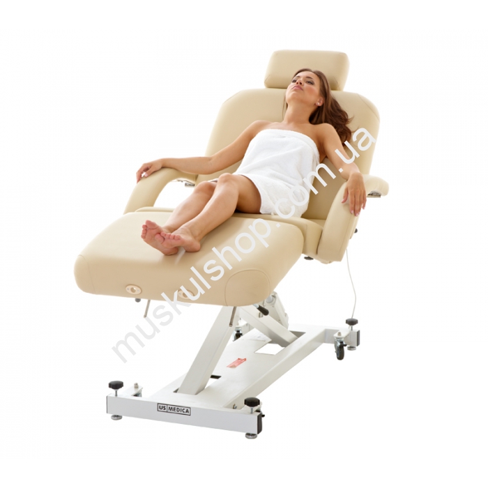 Us Medica Profi состоит из трех регулируемых секций, третья секция регулируется по высоте. Стол оснащен гибкими подлокотниками, двумя съемными подголовниками, полочкой для рук, круглыми бортами, а для удобства перемещения массажного стола предусмотрены колесики. Данная модель способна выдержать нагрузку в 190 кг. Изюминкой стола является электрический привод для подъема стола, а также педаль для регулирования определенной высоты. Стол идеально подойдет пациентам, страдающих лишним весом, а также для людей с большим ростом. Покрытие стола сделано из качественного кожзаменителя. Стол выполнен из высококачественной сплава стали.