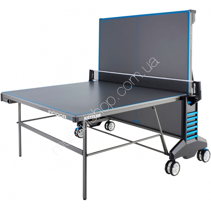 Стол Kettler теннисный модель Indoor 4 выполнен из плиты ДСП синего цвете, общей толщиной 19 мм, обладающей антибликовым покрытием. Все столы Кетлер производятся согласно немецкой технологии, имеют соответствующие сертификаты качества. Теннисный стол оснащен теннисной сеткой, съемного типа, с возможностью регулирования ее высоты и прочности натяжения. Внизу стола предусмотрены держатели ракеток и теннисных мячиков. Система транспортировки состоит из четырех роликов и двух тормозов, ролики поворачивают по ходу движения стола. Размеры стола стандартные, стол предназначен для игры в закрытых помещениях. Конструкция стола складная, состоящая из двух частей, складывает моментально.