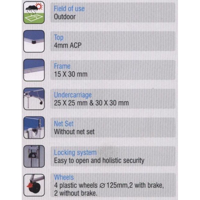Стол всепогодный World Tennis S-8016 выполнен из прочного и качественного меламина, по уникальной технологии АСР. Стол не занимает много места, характеризуется отличным отскоком, а ножки позволяют установить стол его на абсолютно любую поверхность. Столешница 4 мм, окантовка – 30 мм. Несмотря на малый вес, 50 кг, очень устойчивый и прочный, складывается, передвигается на колесиках. Модель произведена, согласно, всех стандартов теннисного качества и различных требований. Стол не укомплектован сеткой, но можно использовать теннисную сетку от любого производителя; стол также покрыт против бликовым покрытием,что весьма практично в момент интенсивных тренировок либо ответственных игр. Столешница стола Outdoor S-8016 синего цвета, что подойдет для игр как в помещениях так и на улице.