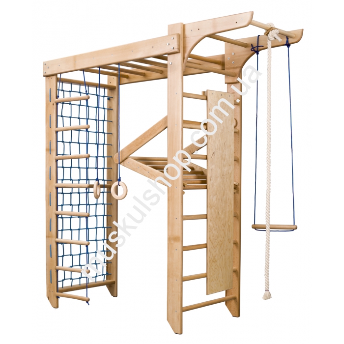 Детский спортуголок Sportbaby Bambino 5-220 комплектуется гладиаторской сеткой, трапецией, канатом, стенкой с турником, съемным турником, доской для пресса, крепежным комплектом, веревочной лестницей, а для безопасности купите мат. Изюминкой комплекса является зигзаговидный рукоход. Бук может выдерживать взрослого с общей массой тела 130 кг, при этом вес комплекса составляет 55 кг. Комплекс не займет много места в комнате, крепится к стенке, нет ничего сложного, в такой схеме разберется любой взрослый. Ваш малыш от занятий на комплексе только выиграет, он помимо хорошего настроения, значительно укрепит свое здоровье. Лучше всего старайтесь приучать ребенка к спортивным снарядам с раннего возраста.