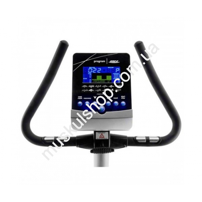 Консоль велотренажера: на консоли размещен двухцветный LCD дисплей с подсветкой, который показывает характеристики выбранного Вами профиля тренировки: скорость, время, пульс (измерение пульса на ручках тренажера, сенсорные датчики измерение пульса на ручках тренажера, возможность подключения нагрудного кардиодатчика), одометр и т.д.;