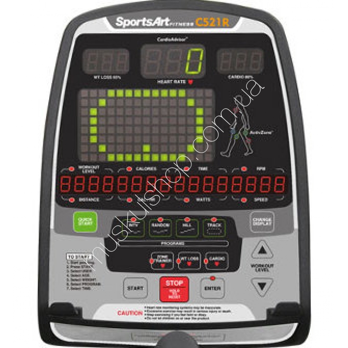 Показания дисплея: отображает скорость, время, дистанция, калории, пульс, обороты в мин, уровень, профиль, Ватты